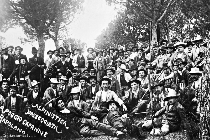 Nel 1903, i Rapolanesi col Sindaco MAGI in testa accompagnati dalla Banda della Filarmonica ma, nonostante la didascalia a sx, non si trattò di una "escursione alpinistica".