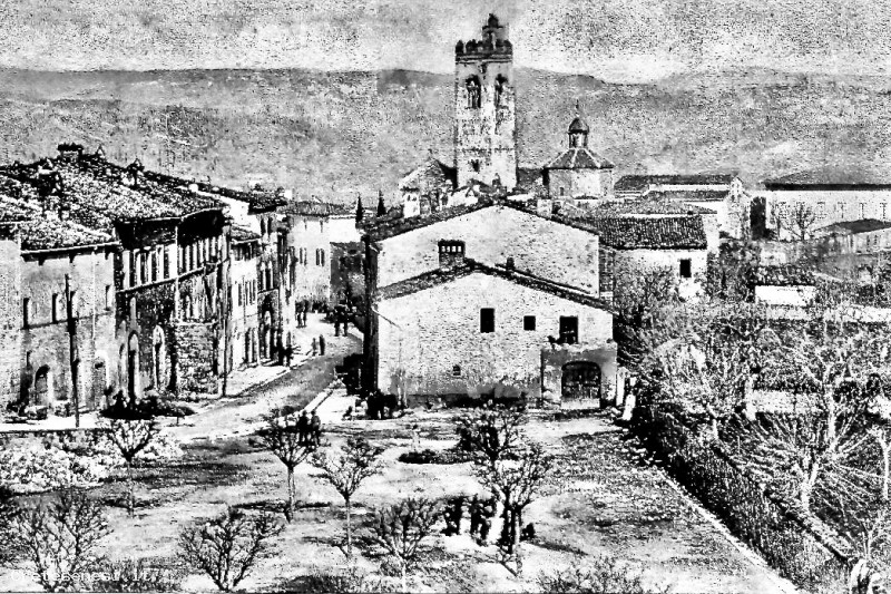 Sulla sinistra si nota il palazzo Spannocchi piuttosto mal ridotto e dotato di un pozzo, successivamente demolito.