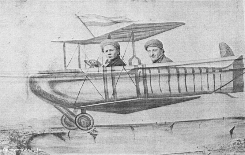 Due giovani ascianesi si sono fatti ritrarre a bordo di un aereoplano disegnato su un telone.