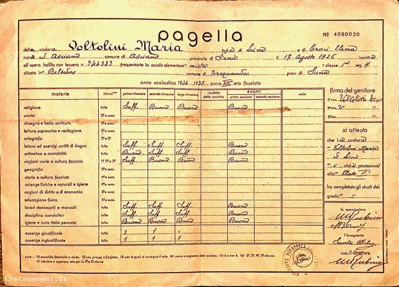1935 - Pagella di Maria Voltolini alla Scuola Rurale di Belsedere Asciano