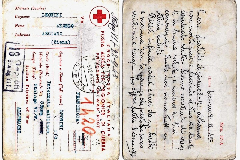Cartolina della Croce Rossa, inviata a Ivo Leonini, priginiero nel campo di concentramento di Bocholt in Germania, dopo essere stato catturato a Lubiana, insieme ai suoi compagni ascianesi nella ex jugoslavia.