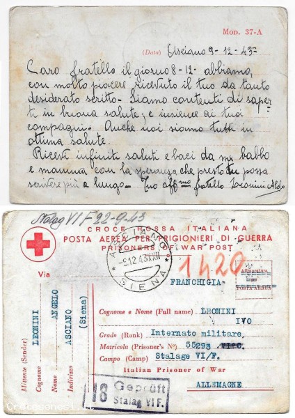 1943, 9 Dicembre - Cartolina a Ivo prigioniero in campo di concentramento Asciano