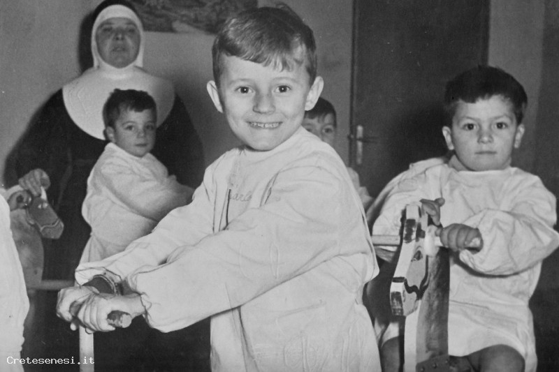 Carlo Mancini, fratello di Alessandra, sulla giostra con rotaia di ferro insieme ad altri bambini.