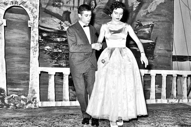 Due bellissimi giovani locali recitano insieme in una commedia brillante, cantata e ballata sul palcoscenico del Cinema Parrocchiale.