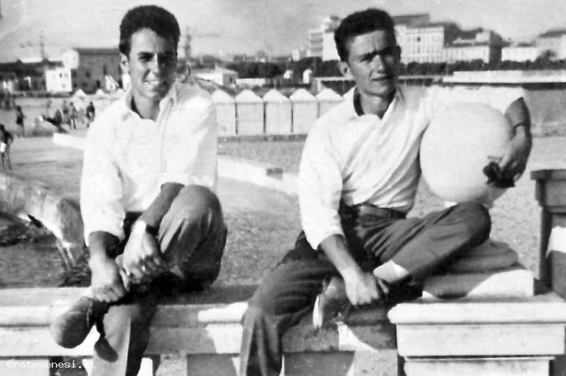 Non conosciamo il motivo che lega la Filarmonica di Asciano con Piombino, resta il fatto che negli anni sono stare diverse le trasferte della banda in quella cittadina. Qui si vedono due giovani componenti la banda ritratti su una terrazza sul mare: