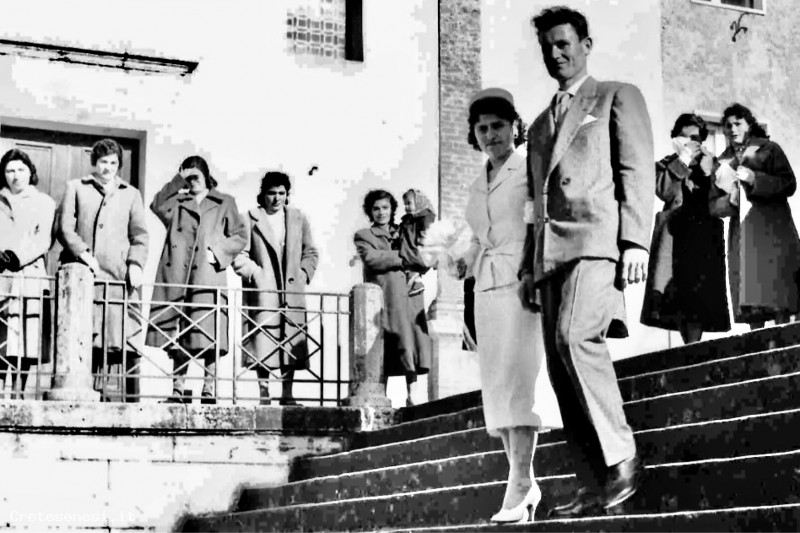 1958, Sabato 25 Gennaio – Fosco e Bruna, scendono le scale della chiesa Asciano