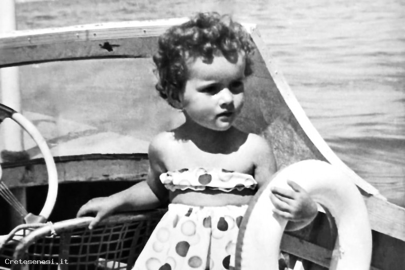 Antonella Gallorini al mare a Follonica, immortalata su un motoscafo di legno come erano allora, pronta per una gita in mare, ma con la sua ciambella di salvataggio ben stretta.