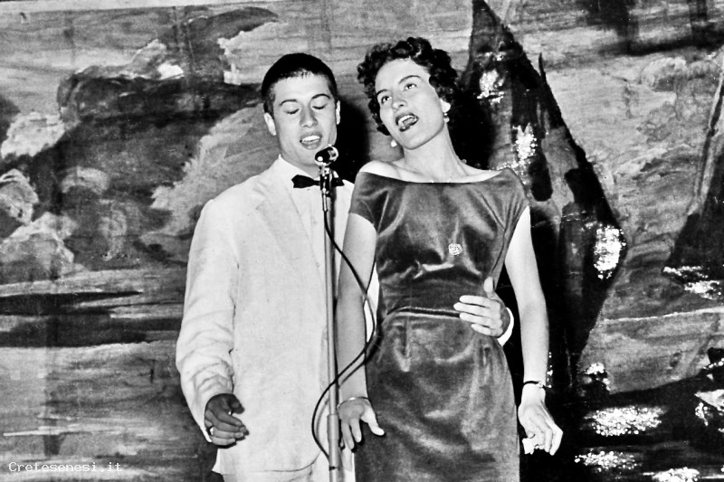 Due giovani locali si esibisconoo cantando in coppia, durante uno spettacolo canoro, presumibilmente svoltosi al Cinema Parrocchiale.