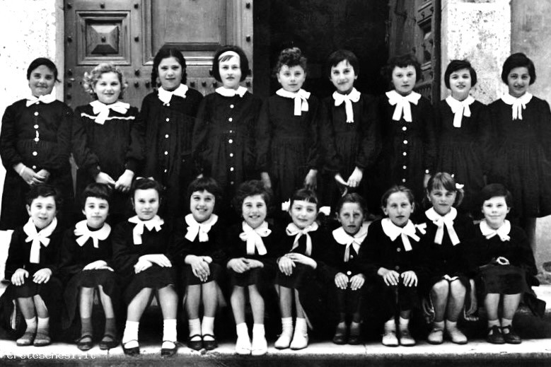 Alunni da sinistra in alto: Anna Voltolini, Maria Erina Giulietti, Chiara Bechi, Simonetta Tognazzi, Angiolina Stolli, Liria Pietrelli, Ivana Farinelli, Liana Sadotti, Lina Donati, Mirella Palazzi, Silvia Rossolini, Loredana Stopponi, Nara Soldati, Franca Mariotti, Alida Betti, ? Decicco, ? Decicco, Marcella Bari.