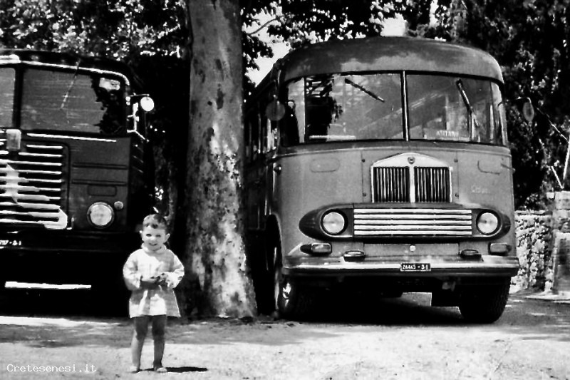 Ma il pezzo più interessante è il pullman parcheggiato sotto gli alberi, che in quegli anni faceva servizio fra Asciano, Serre e Rapolano per trasportare gli oprai della "Cava Rinascente" a spese dell'azienda.