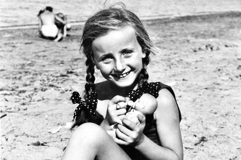 Una piccola Eleonora Vanni, sulla spiaggia di Marina di Grosseto, che gioca a fare la mamma con il suo bambolotto.