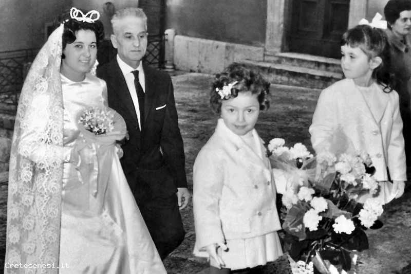 La sposa sulle scale della chiesa, accompagnata dal babbo, Gino Meioni e preceduta dalle damigelle: Michela Barbi e Luana Meioni.