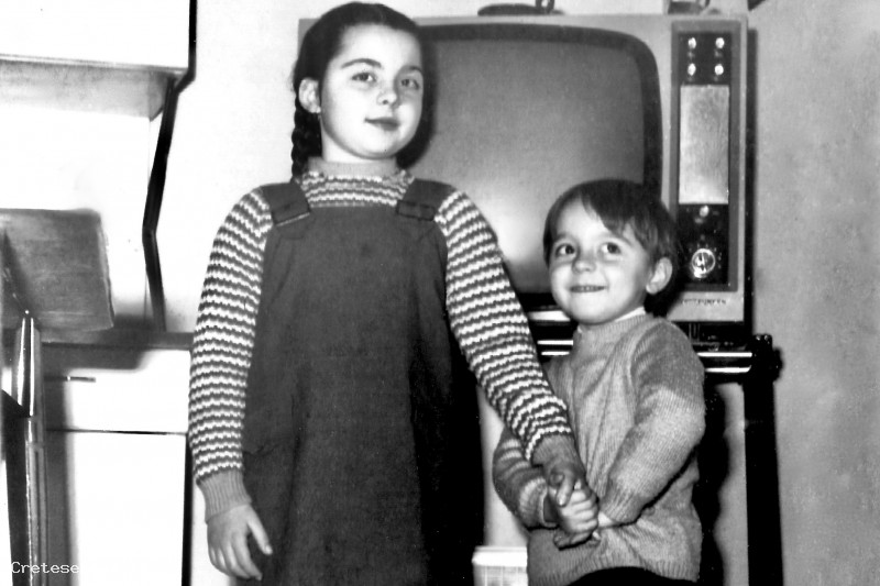 Una giovanissima Alessandra Fratagnoli tiene per mano il fratellino Fabrizio nella cucina di casa.