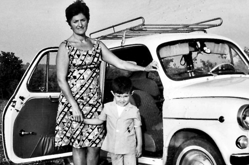 Umberto Mancini con la mamma Maria Luisa acanto alla mitica Fiat 600 con gli sportelli ancora apribili in avanti.