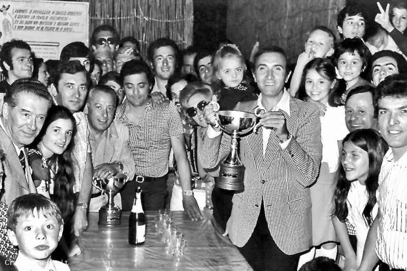Pippo Baudo premiato per la sua partecipazione alla Mostra Mercato Ascianese, mostra con piacere la coppa ricevuta, circondato da una folla di personaggi locali: