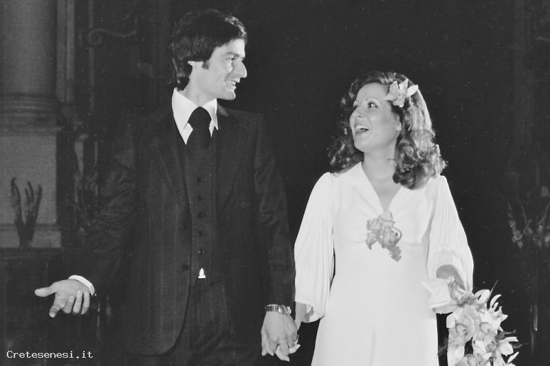1975, Domenica 19 Ottobre - Gli sposi si avviano felici fuori dalla chiesa Asciano