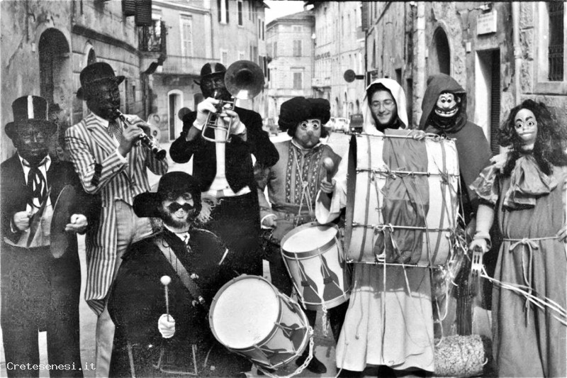 Foto scattata una domenica mattina di carnevale che ritrae alcuni buontemponi, componenti della locale Filarmonica, organizzatisi per costituire una piccola orchestrina temporanea.