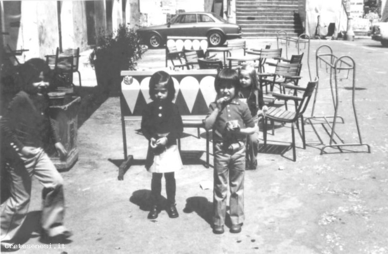 In una piazza piuttosto disadorna, quando ancora esisteva il posteggio delle auto e non c'erano gli alberi, ci sono quattro bambini.