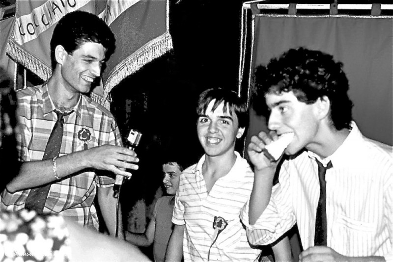 1985 - Cena propiziatoria della Corona. Giovani contradaioli a capo tavola Asciano