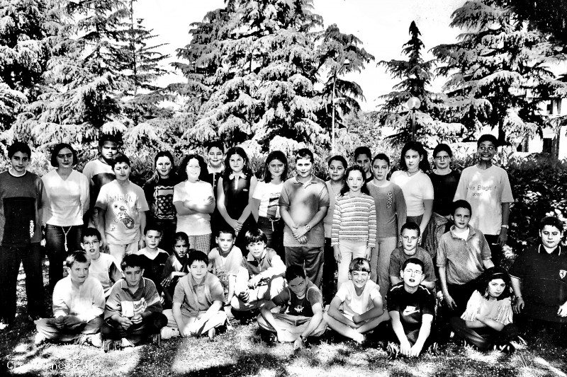 Un numeroso gruppo di ragazzini e ragazzine nella fase di passaggio fra Elementari e Medie Inferiori.