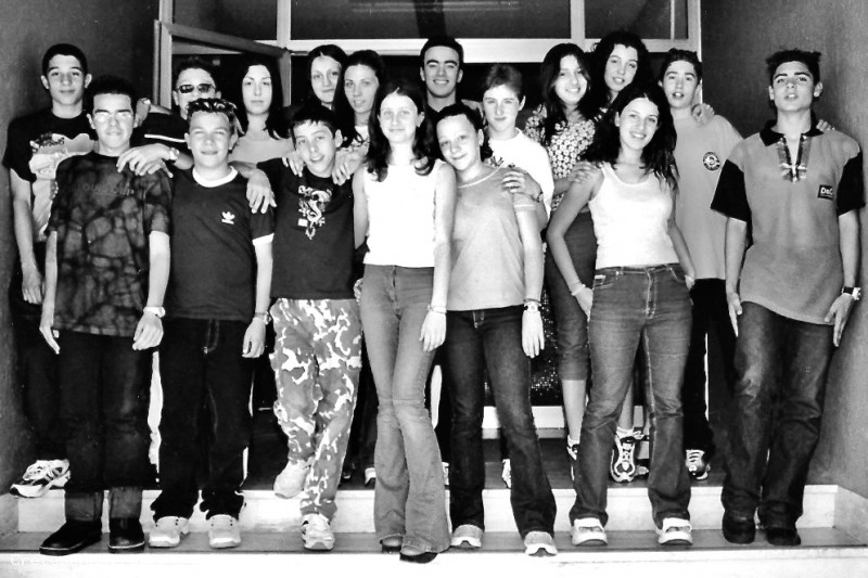Fra gli studenti fotografati sulle scale d'ingresso della nuova Scuola Media "Sandro Pertini", si riconoscono, partendo da sinistra: