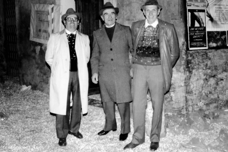 La foto scattata durante una domenica di carnevale all'angolo fra corso Matteotti e via Giovanni d'Asciano, ritrae tre vecchi amiciche per una vita intera anno fatto gli artigiani: Alberto Cantelli, meccanico con l'officina in via Delle Fonti Siro Francini, falegname con l'ultimo laboratorio nella zona industriale Giovanni Cantelli, muratore nella locale cooperativa edile che, fino agli anni '60, esisteva in loco.