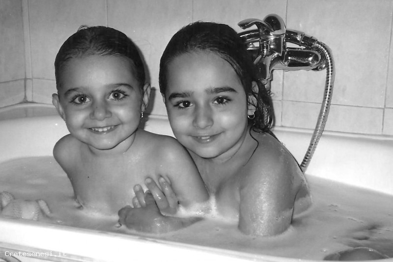 Bellissima immagine di due sorelline durante il bagno nella vasca di casa: