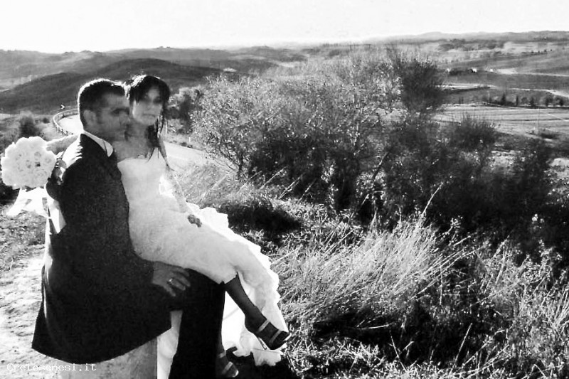 Gli sposi dpo la cerimonia in chiesa seduti sulla collinetta lungo la Lauretana Antica, impegnati a godersi insieme il magnifico paesaggio di Leonina: