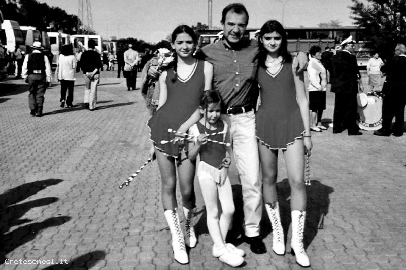 Alberto Coradeschi, al seguito della Filarmonica Giuseppe Verdi di Asciano in trasferta a Mirabilandia, è circondato da Majorette speciali, le sue tre belle figlie: