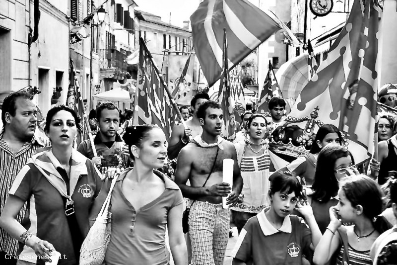 Gruppo di appartenenti alla Contrada della Corona fanno il loro igresso in Piazza Garibaldi, per festeggiare la vittoria.
