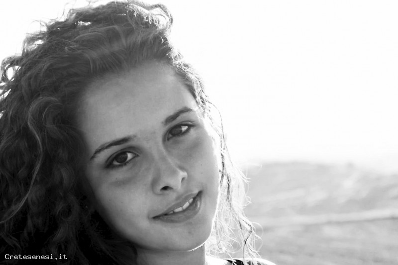 Primo piano di Marta Papi in mezzo alle Crete Senesi.