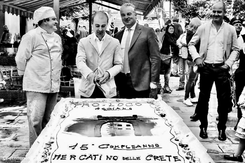 Foto che riprende la festa dei 15 anni dalla nascita del Mercatino delle Crete Senesi. Presenti al taglio della mega torta: