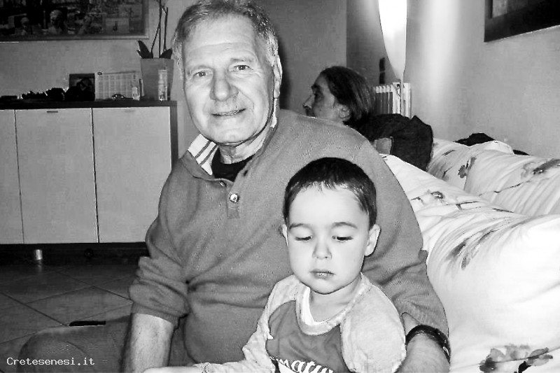 Bel ritratto di Franco Fregoli seduto sul divano di casa accanto al nipotino Matteo Gallorini, figlio di Laura, la primogenita che vive ad Arezzo.