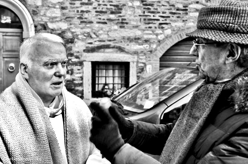 Padre Celso Bidin mentre parla con Claudio Farnetani nella piazzetta del castellare.