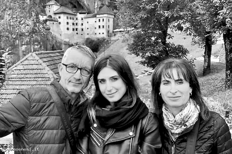 Bel ritratto dell'intera famiglia in vacanza in Slovenia Il castello alle loro spalle è quello di Predjama