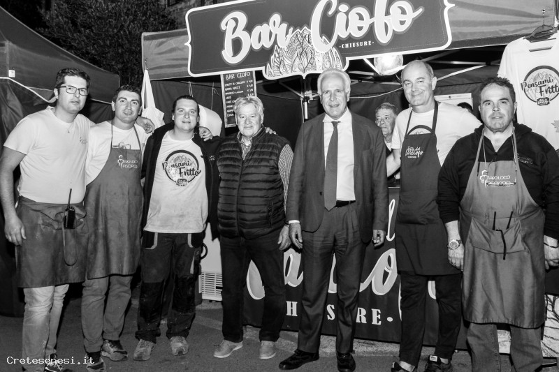 Nella foto è ritatto sorridente inseme al Sindaco Fabrizio Nucci e alla squadra di volontari della Pro Loco di Asciano in servizio alla Festa del Carciofo.