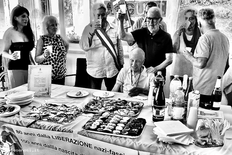 Dopo il taglio della torta, è il momento del brindisi di auguri collettivo alla salute di Enrico Boccini, l'amico centenario.