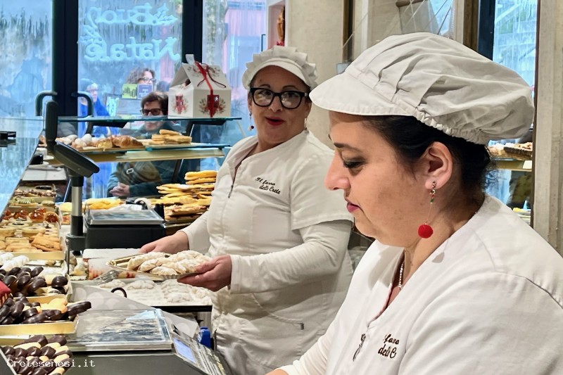 Stamani, al Forno delle Crete si respirava un atmosfera frizzante, non a causa dell'intenso fretto esterno, ma per un clima di festa che pervadeva tutto: una grande abbondanza di dolci, la gentilezza delle signore di là dal banco e l'ineccepobile loro trucco in clima Natalizio.