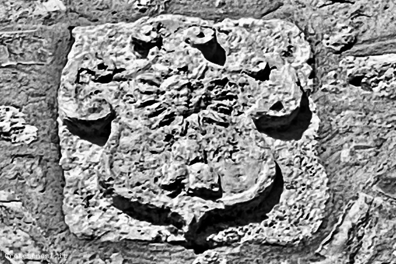Sull'edificio principale di Scurcoli, podere situato a sinistra in alto sulla strada Asciano-Rapolano, poco prims del bivio per serre, è stao individuato questo sconosciuto stemma araldico, scolpito in travertino.