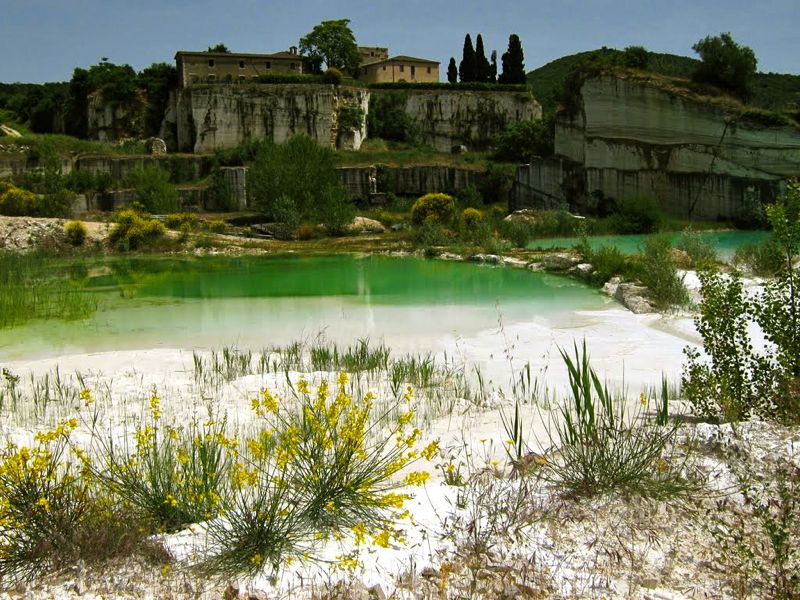 Attraversato il passaggio a livello, si trova il bivio per le cave di travertino sulla destra. Qui inizia il percorso della pietra caratterizzato da visioni sorprendenti sulle vecchie cave di travertino, spesso invase dall'acqua dopo il loro abbandono.