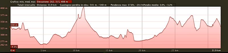 Percorso abbastanza lungo, per circa due terzi su asfalti e su strada bianca imbrecciata per il resto. Pendenze da affrontare non particolarmente impegnative.