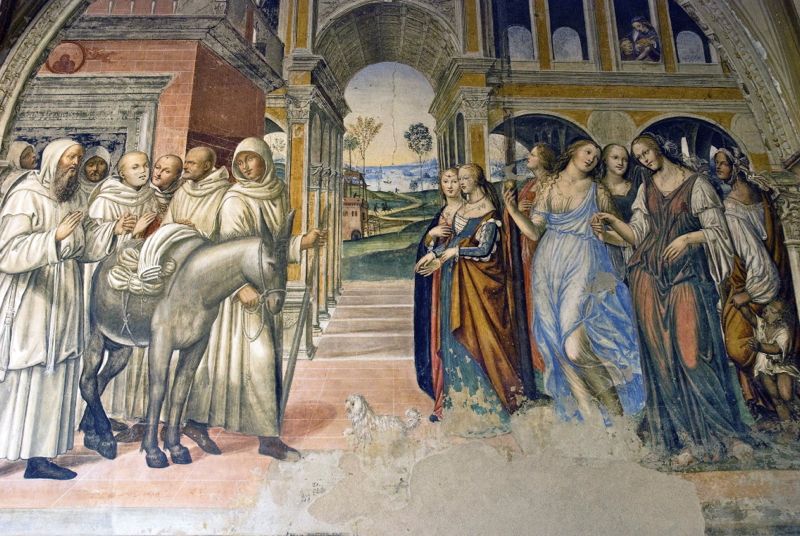 Lo sfondo presenta un magnifico scenario architettonico e la scena presenta le persone divise in due gruppi: a destra le giovani donne, alcune danzanti e sulla sinistra i monaci con san Benedetto. Forse il miglior affresco del gruppo, con notevoli influssi leonardeschi.