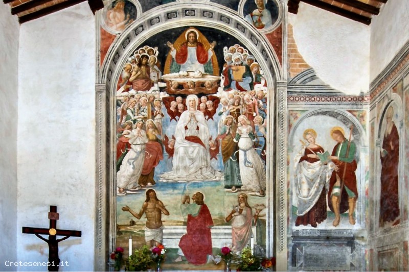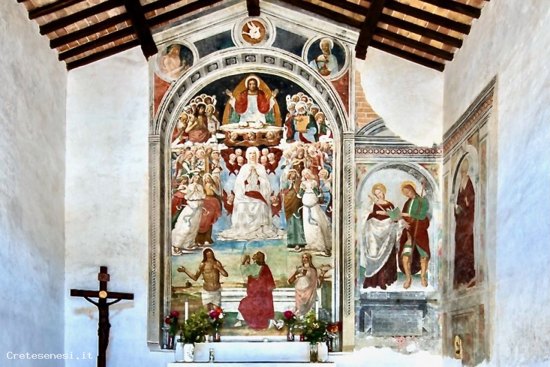 Invece i tre santi: San Girolamo, San Rocco e Santa Lucia, dipinti entro finte edicole sul muro a destra dell'altar maggiore, sono opera di giovani allievi della bottega di Benvenuto di Giovanni e sono specificamente datati 1497.