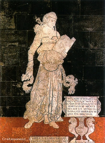 Questa sibilla fece di Samo la sua principale dimora, sebbene fosse nata nella Troade; a darci conto di lei fu Eratostene. Firmata da Matteo di Giovanni, è datata sul supporto della tabella 1483. Raffigurata come una principessa slanciata, con i drappeggi e i nastri della chioma svolazzanti, regge nella mano sinistra un volume aperto, dalla ricca legatura. Un tratto curioso e caratteristico del lavoro di Matteo emerge evidente nella graziosa testa di cherubino ad ali spiegate che chiude una cintura attorno alla sua veste sotto i fianchi. La tabella accanto a lei, sorretta da due figure dalla testa leonina, contiene la scritta: tu enim stulta iudaea deum tuum non cognovisti lucentem mortalium mentibus sed et spinis coronasti orridum que fel miscuisti («Poiché tu, stolta giudea, non hai riconosciuto il tuo Dio, risplendente nelle menti degli uomini. Ma lo hai coronato di spine e hai versato per lui del fiele amarissimo»), un riferimento allo scetticismo degli ebrei nel riconoscere il Cristo.