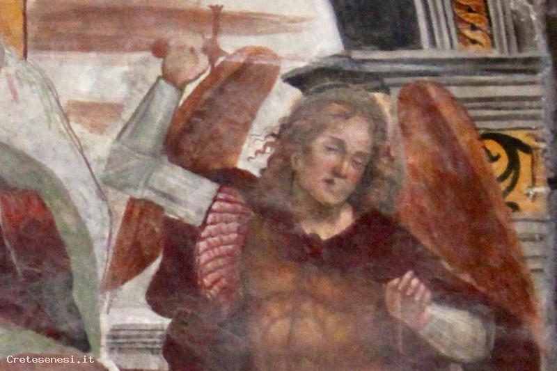 Sempre sul lato sinistro in basso, è presente una piccola figura inginocchiata, raffigurante un frate olivetano. Questa rappresentazione e le sue ridotte dimensioni, starebbero ad indicare che l’affresco fu dipinto su committenza olivetana, probabilmente in contemporanea alla realizzazione del ciclo di affreschi del Sodoma, dedicati alla vita di San Benedetto, fra il 1505 e il 1508. Affreschi che si possono ancora ammirare all’interno del chiostro maggiore di Monte Oliveto.