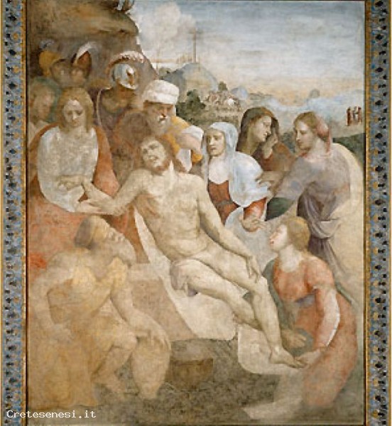 Nonostante il forte deterioramento della superficie pittorica causato dallo strappo e dal conseguente trasferimento su tela dell’affresco (1962), la ‘Deposizione’ del Monte dei Paschi si qualifica fra le opere più alte e rappresentative del Riccio: la composizione trova il suo fulcro nel corpo esanime e sofferente di Gesù attorno al quale, seguendo l’andamento diagonale degli assi del dipinto, vengono sapientemente orchestrate le figure dai volumi ampi e dai nobili gesti dei seguaci del Cristo, eredi diretti di quella composta e grandiosa umanità che si ritrova nelle pitture del più classico Baldassare Peruzzi: la concitazione disperata delle Marie che si affollano presso il Salvatore sembra trovare soluzione nei gesti pietosi e
