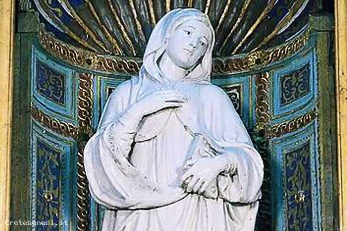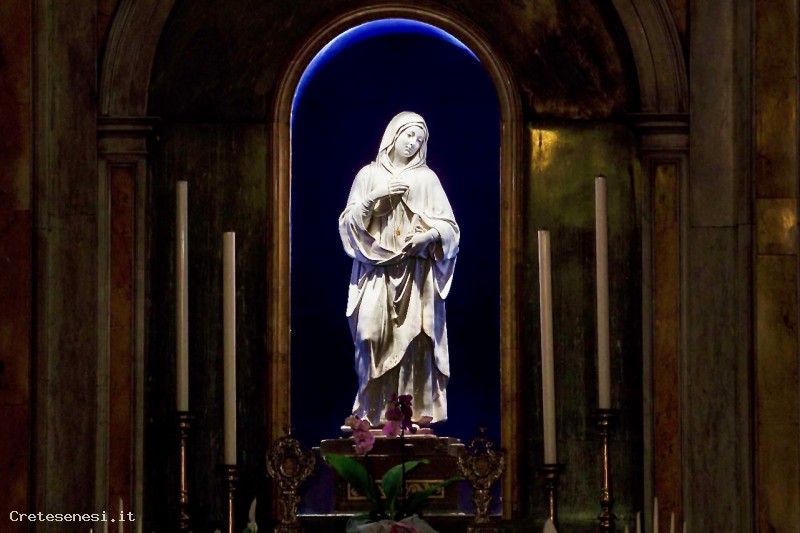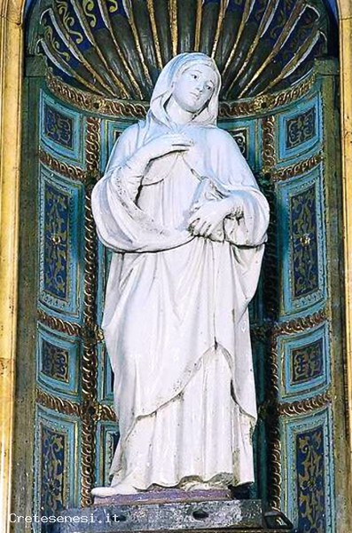 La statua è situata in una nicchia in legno intagliato, dipinto e dorato. Dalla bibliografia risulta un restauro eseguito nel 1779 da un non meglio identificato Maestro Giocondo di Siena. Lo stemma ricorda molto da vicino quello adottato dalla famiglia Borghesi ai primi del Cinquecento; sono però del tutto diversi gli smalti, ed è quindi impossibile una corretta identificazione.