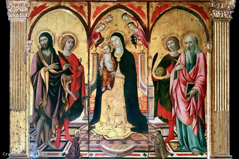 Sulla sinistra, sono riconoscibili San Giovanni Battista e San Quirico e sulla destra San Fortunato e San Giovanni Evangelista.