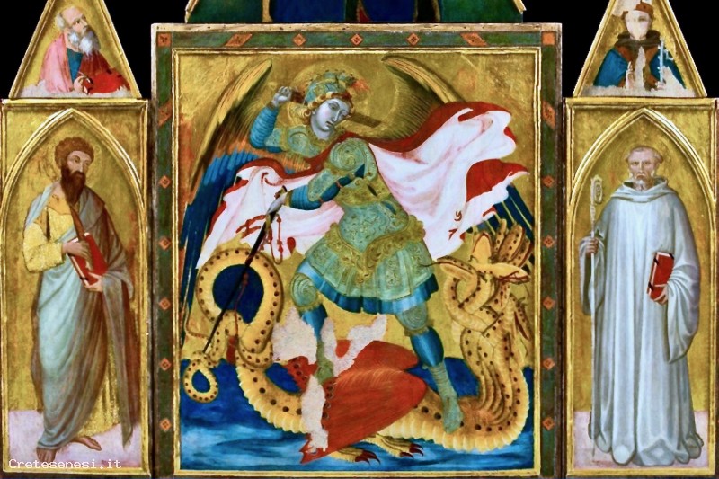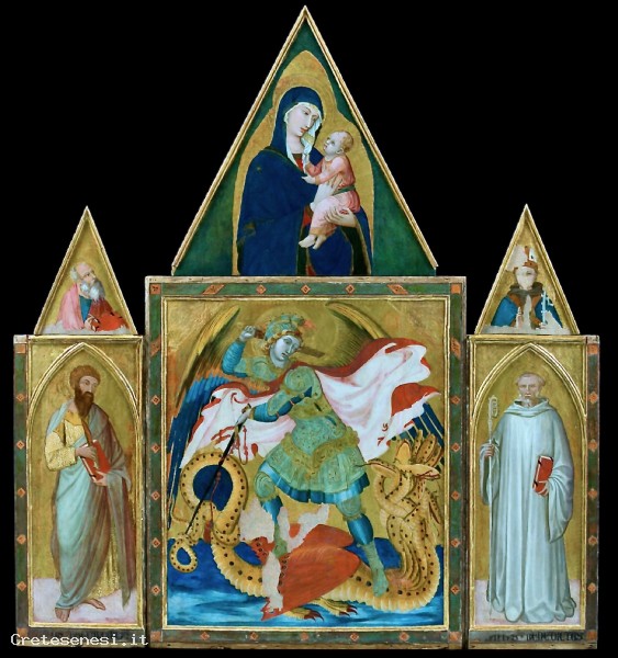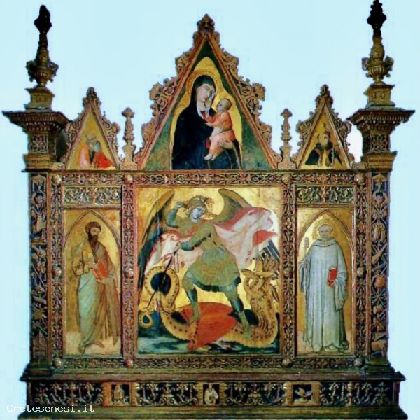 Il trittico rappresenta San Michele Arcangelo che uccide il drago e i Santi Bartolomeo e Benedetto. L'opera proviene dalla vicina Badia a Rofeno e fu realizzato dal noto pittore senese autore degli affreschi del Buongoverno nel Palazzo Pubblico di Siena, forse in tempi diversi.