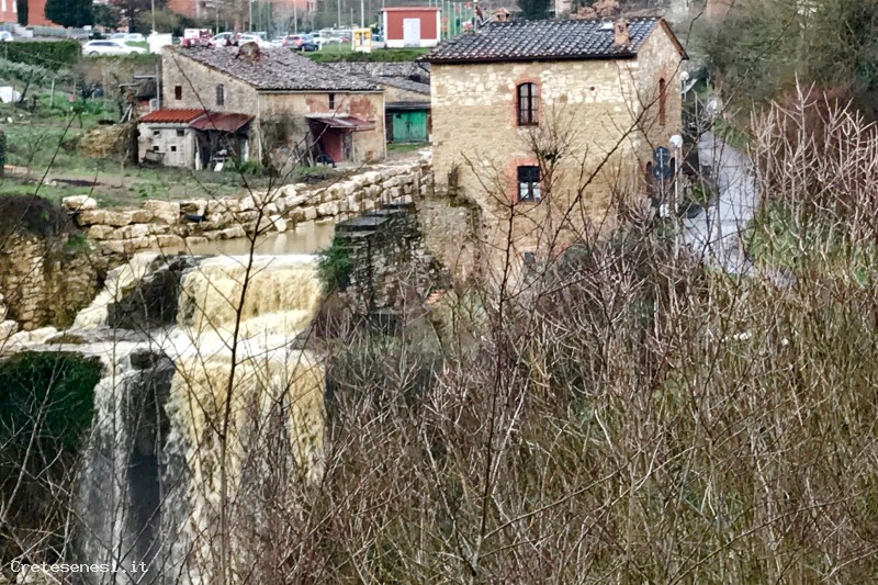La gora di alimentazione del Mulino, anzichè essere, come negli altri Mulini a latere del corso d'acqua, è ricavata direttamente nell'alveo del fiume, con la costruzione di un robusto sbarramento pochi metri prima della cascata.